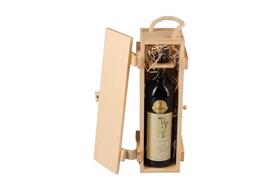 Dřevěná krabička na 1 láhev vína s logem Vinum Palaviense. Kožené panty.